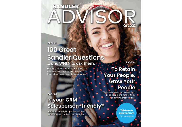 The Sandler Advisor is a complimentary quarterly e-newsletter filled with relevant, real-world sales and leadership topics designed to help you succeed. From business development and sales prospecting to leadership coaching, management, and recruitment, the Sandler Advisor has it all.